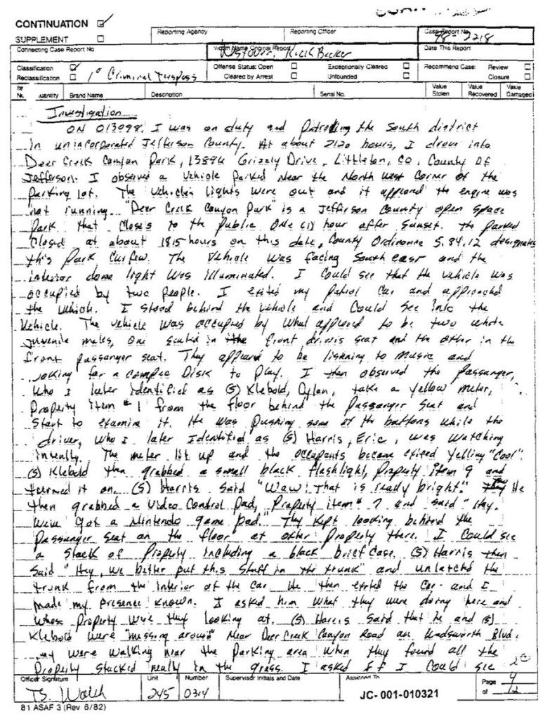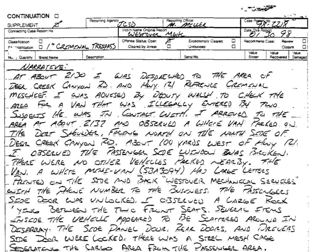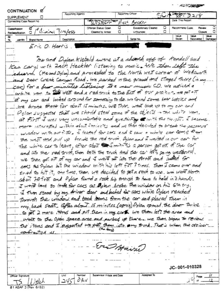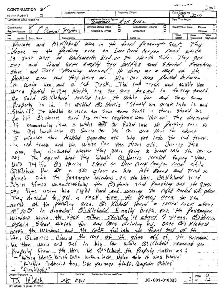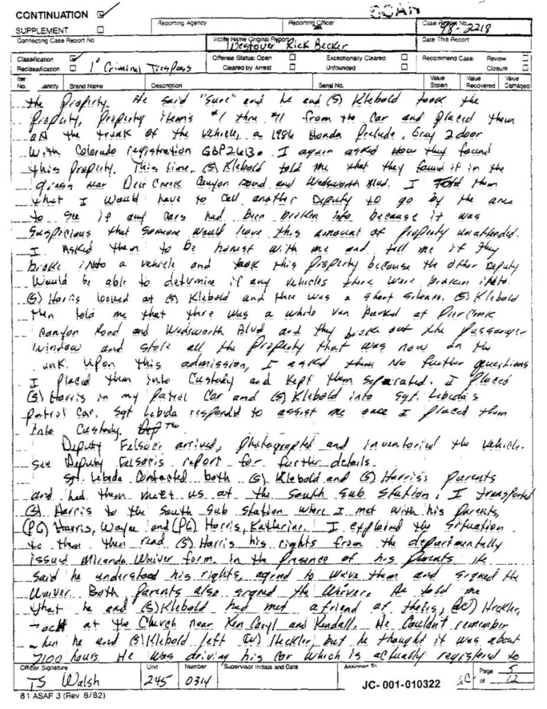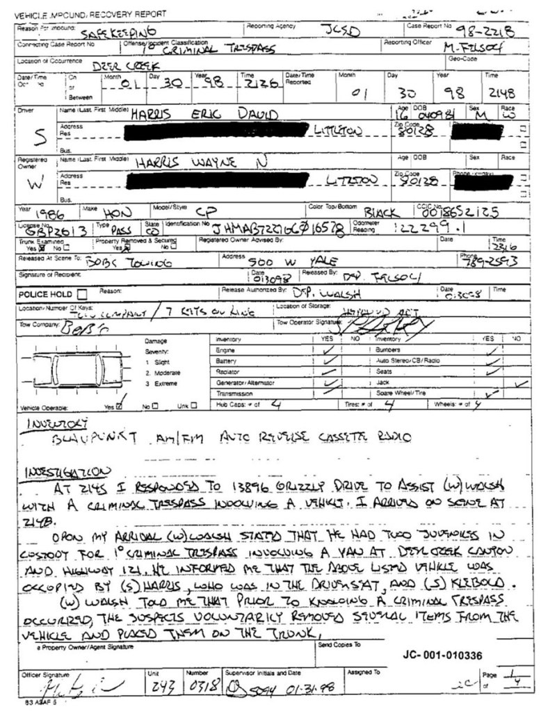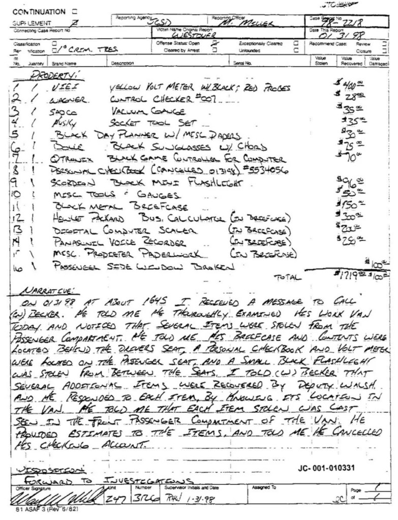 Eric’s written statement about the crimeWhat was stolenValue of the stolen itemsDeputy Miller was dispatched and got in touch with Ricky BeckerDeputy Felsoci impounded Eric’s car, took pictures, recovered items and it’s inventory. Eric’s signed the form with his parents, saying he understood his rights and agreed to waive them.Eric’s father, Wayne, contacted the police to retrieve a rented movie that had been collected as evidence from Eric’s car.Eric and his father went to collect it, Wayne signed the return of property form.On February 1998 Eric returned to pick up his own belongings that the police as confiscated as evidence.Eric’s incident report Eric’s custody report 4 pages of the interview conducted by Deputy Walsh.Eric’s juvenile diversion agreement papers signed.Both pictures are Eric’s filled out mental health check list forms, mandatory and ordered by their agreement.Eric began his community service in May 1998 and completed the hours in August 1998. He spaced out the hours due to ending up working two jobs. He did all his hours at The link recreation centre.Finale notes on Eric diversion counsellor Early termination from the program.