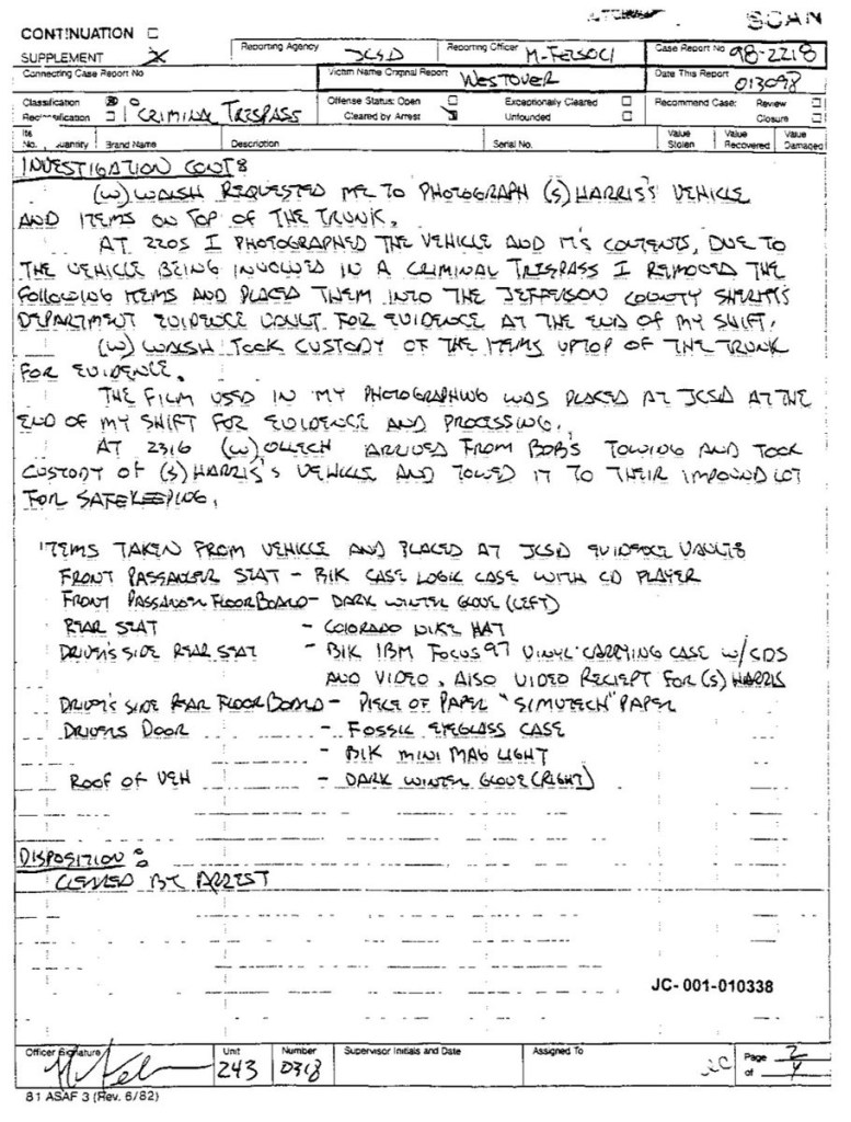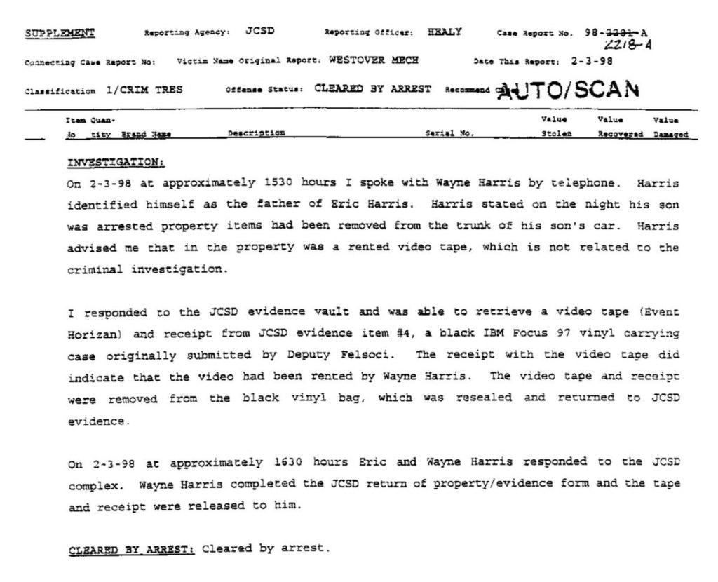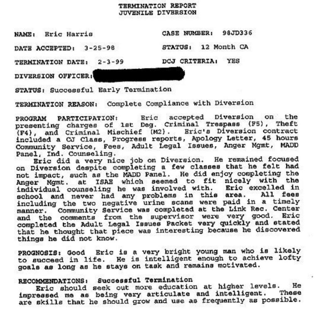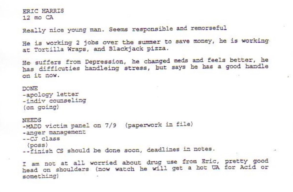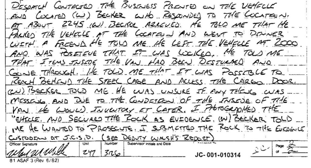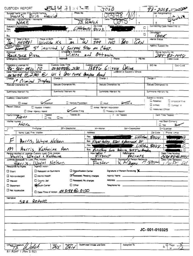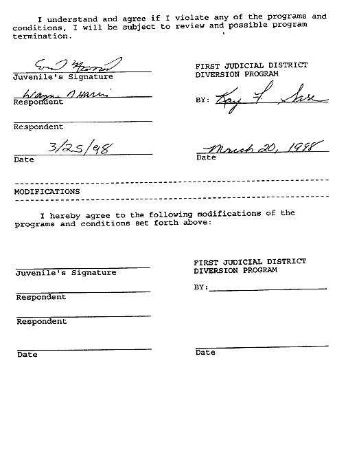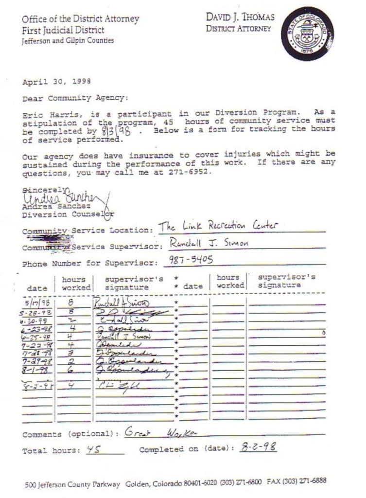 Eric’s written statement about the crimeWhat was stolenValue of the stolen itemsDeputy Miller was dispatched and got in touch with Ricky BeckerDeputy Felsoci impounded Eric’s car, took pictures, recovered items and it’s inventory. Eric’s signed the form with his parents, saying he understood his rights and agreed to waive them.Eric’s father, Wayne, contacted the police to retrieve a rented movie that had been collected as evidence from Eric’s car.Eric and his father went to collect it, Wayne signed the return of property form.On February 1998 Eric returned to pick up his own belongings that the police as confiscated as evidence.Eric’s incident report Eric’s custody report 4 pages of the interview conducted by Deputy Walsh.Eric’s juvenile diversion agreement papers signed.Both pictures are Eric’s filled out mental health check list forms, mandatory and ordered by their agreement.Eric began his community service in May 1998 and completed the hours in August 1998. He spaced out the hours due to ending up working two jobs. He did all his hours at The link recreation centre.Finale notes on Eric diversion counsellor Early termination from the program.