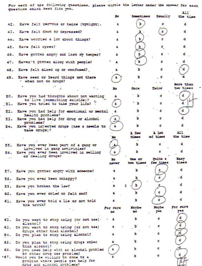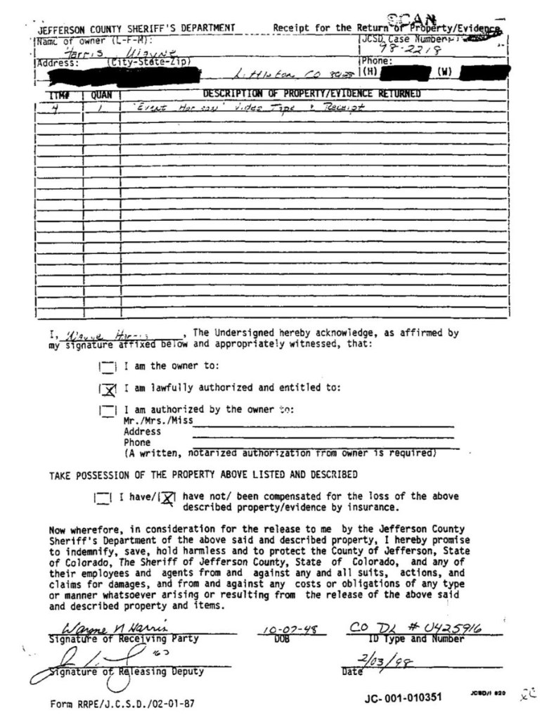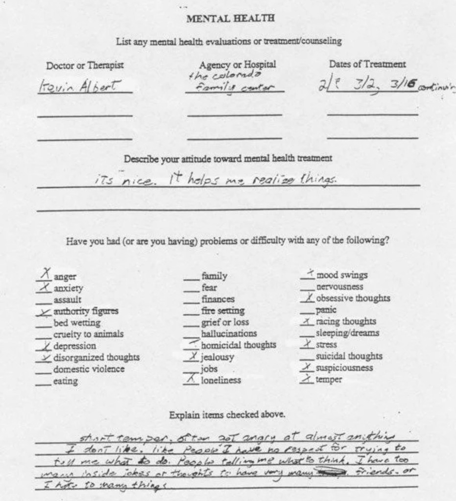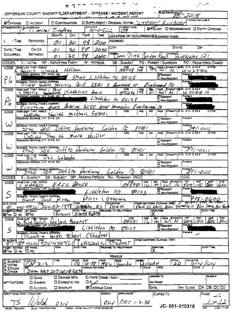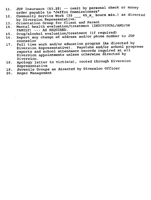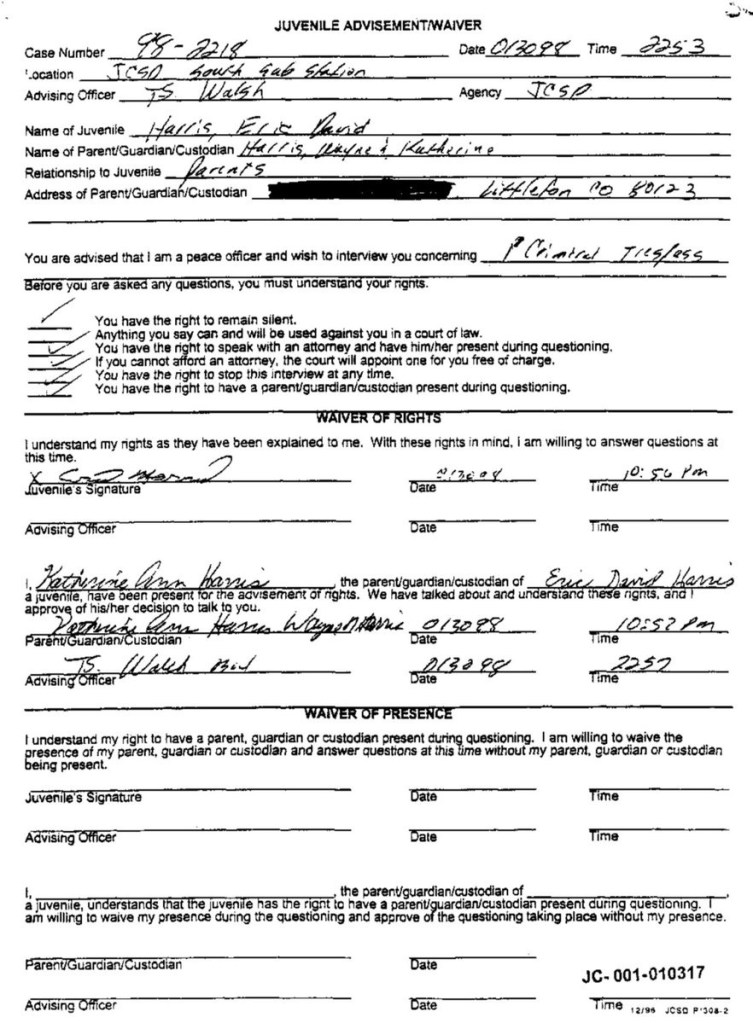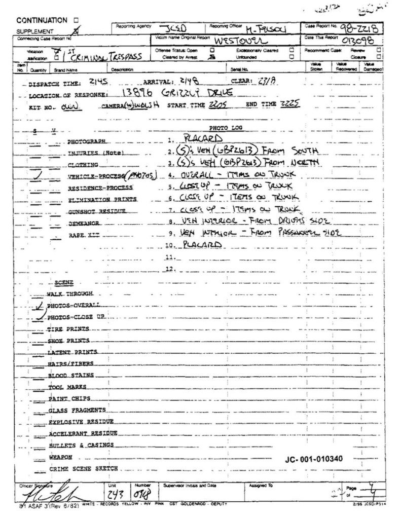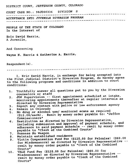 Eric’s written statement about the crimeWhat was stolenValue of the stolen itemsDeputy Miller was dispatched and got in touch with Ricky BeckerDeputy Felsoci impounded Eric’s car, took pictures, recovered items and it’s inventory. Eric’s signed the form with his parents, saying he understood his rights and agreed to waive them.Eric’s father, Wayne, contacted the police to retrieve a rented movie that had been collected as evidence from Eric’s car.Eric and his father went to collect it, Wayne signed the return of property form.On February 1998 Eric returned to pick up his own belongings that the police as confiscated as evidence.Eric’s incident report Eric’s custody report 4 pages of the interview conducted by Deputy Walsh.Eric’s juvenile diversion agreement papers signed.Both pictures are Eric’s filled out mental health check list forms, mandatory and ordered by their agreement.Eric began his community service in May 1998 and completed the hours in August 1998. He spaced out the hours due to ending up working two jobs. He did all his hours at The link recreation centre.Finale notes on Eric diversion counsellor Early termination from the program.