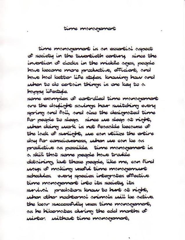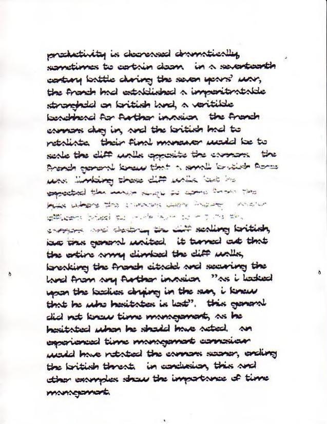 time management is an essential aspect of society in the twentieth century. since the invention of clocks in the middle ages, people have become more productive, efficient, and have had better life styles. knowing how and when to do certain things is one key to a happy lifestyle.some examples of controlled time management are the daylight savings hour switching every spring and fall, and also the designated time for people to sleep. since we sleep at night, when doing work is not feasible because of the lack of sunlight, we can utilize the entire day for consciousness, when we can be as productive as possible. time management is a skill that some people have trouble obtaining, but those people, like me, can find ways of making useful time management schedules. every species integrates effective time management into its society, its survival. predators know to hunt at night, when other nocturnal animals will be active. the bear successfully uses time management, as he hibernates during the cold months of winter. without time management, productivity is decreased dramatically, sometimes to certain doom. in a seventeenth century battle during the seven years’ war, the french had established a impenetratable stronghold on british land, a veritable beachhead for further invasion. the french cannons dug in, and the british had to retaliate. their final maneuver would be to scale the cliff walls opposite the cannons. the french general knew that a small british force was making those cliff walls, but he expected that no more than a small fraction of men would make it up alive.when he awoke to see the vast scaling british, this general waited. it turned out that the entire army climbed the cliff walls, breaching the french citadel and securing the land from any further invasion. “as i looked upon the bodies drying in the sun, i knew that he who hesitates is lost”. this general did not know time management, as he hesitated when he should have acted. an experienced time management association would have rotated the cannons sooner, ending the british threat. in conclusion, this and other examples show the importance of time management