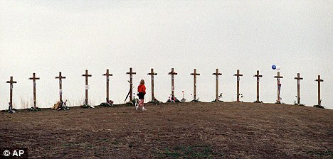 Columbine memorial featuring crosses for Eric and Dylan, after the original ones from the 15 wooden crosses got taken down.