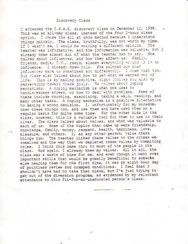 I attended the I.S.A.E. discovery class on December 12, 1998. This was an all-day class, instead of four 2-hour options. I chose the all in once method since I understand things quickly. The class, truthfully, was not worth my time. If I wasn’t me, I would be voicing a different opinion. The teacher was informative, and the information was valuable, but I already knew almost all of what the teacher had to say. She talked about influences and how they affect us. Family, friends, media, T.V., radio, almost everything around is an influence. I already knew this. She pointed out that influences make us sometimes act differently. I knew that too. Our class also talked about how to get what we wanted out of life. This is by making positive, right choices and also by persevering towards there goals. We talked about coping mechanisms. A coping mechanism is what one uses to handle/manage stress, or how to deal with problems. Some of these include counting, exercising, taking a walk, reading, and many other tasks. A coping mechanism is a positive alternative to making a wrong decision. I, unfortunately for my boredom, knew these things too, and use them and have used them on a regular basis for quite some time. For the other kids in the class, however, this is a valuable tool for them to use in their lives. The class talked about values, and what was valuable of each of us. Some of the topics that came up were friendship, knowledge, family, money, respect, health, happiness, love, pleasure and others. I, as any other person, value these things too. The teacher linked these values to the crimes we committed and the way that we depleted these values by committing crime. I think this came thru to most of the people in the class. And again, I already knew my values. All in all, the class was a waste of time for me, and even though it went over important skills that would be greatly beneficial to someone else hearing them for the first time, it was an eight hour day of pointless review and cramped conditions. I feel that I shouldn’t have had to take that class, but I’m just trying to get out of the diversion program, as evidenced by my reluctant attendance to this fit-for-an-uneducated person’s class.