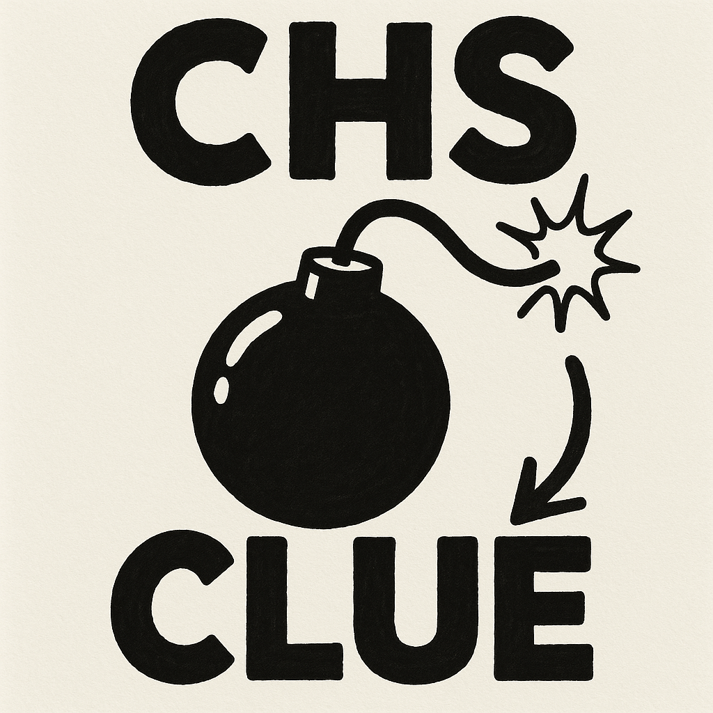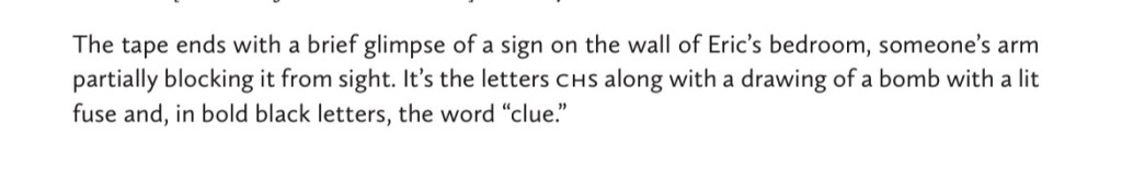 In the transcript of the basement tapes there’s also a description of a sign in Eric’s bedroom with CHS written on it a hand drawn picture of a bomb. In bold black letters clue is written.
