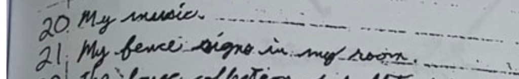 Eric also described having fence signs in his room in his school assignment: 25 things that make me different school assignment. I’m assuming one of them is a danger sign, since that was taken from his room by the police.