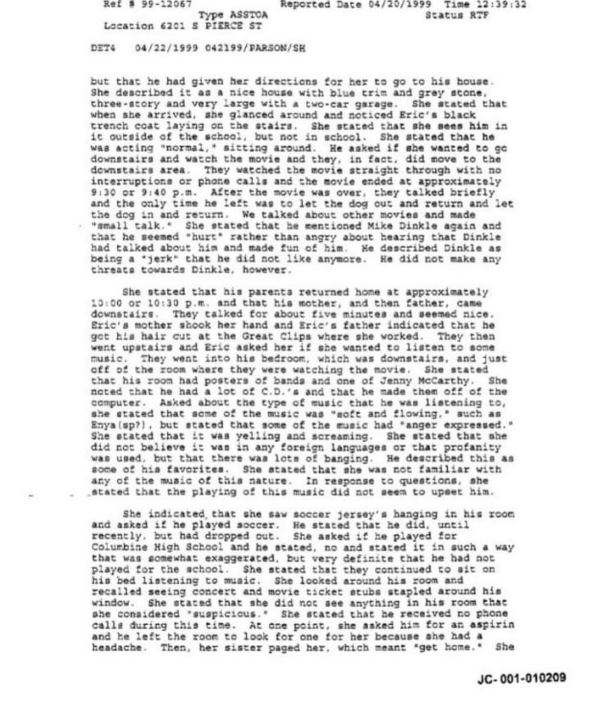 She indicated, that she saw soccer jersey’s hanging in his room and asked if he played soccer. He stated that he did, until recently, but had dropped out. She asked if he played for Columbine High School and he stated, no and stated it in such a way that was somewhat exaggerated, but very definite that he had not played for the school. She stated that they continued to sit on his bed listening to music. She looked around his room and recalled seeing concert and movie ticket stubs stapled around his window. She stated that she did not see anything in his room that she considered “suspicious.” “