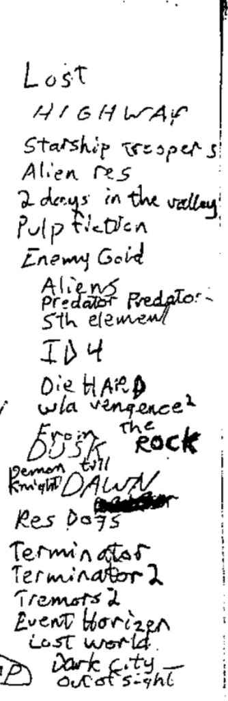 Eric mentioning movies in Dylan’s 1998 yearbook. Possibly ticket stubs for some of these.