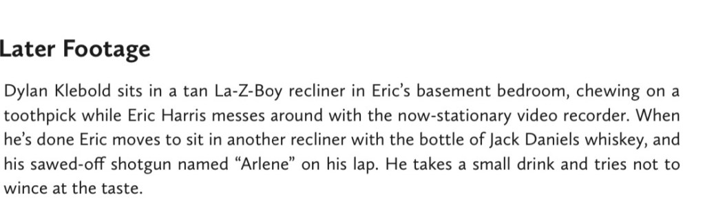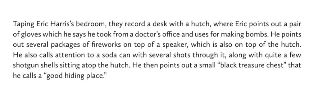“Eric’s bedroom was in the basement. His shelves were lined with boxes of old firecrackers and a collection of miniature cars. A poster with one of his favorite musical groups, KMFDM, was taped to the ceiling.”