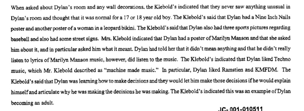 “When asked about Dylan’s room and any wall decorations, the Klebold’s indicated that they never saw anything unusual in Dylan’s room and thought that it was normal for a 17- or 18-year-old boy. The Klebold’s said that Dylan had a Nine Inch Nails poster and another poster of a woman in a leopard bikini. The Klebold’s said that Dylan also had three sports pictures regarding baseball (Roger Clemens, Lou Gehrig) and also had some street signs. Mrs. Klebold indicated that Dylan had a poster of Marilyn Manson and that she asked him about it, and in particular asked him what it meant. Dylan had told her that it didn’t mean anything and that he didn’t really listen to lyrics of Marilyn Manson music, however, did listen to the music. The Klebold’s indicated that Dylan liked Techno music, which Mr. Klebold described as “machine made music.” In particular, Dylan liked Rammstein and KMFDM.”