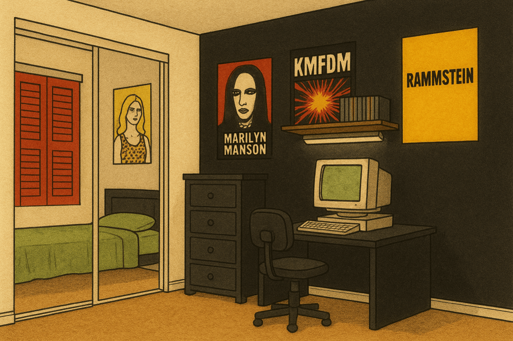 His room had posters covering the walls, including Nine Inch Nails, Marilyn Manson, KMFDM, street signs, and sports figures like Lou Gehrig, Roger Clemens, and Randy Johnson. There was also a poster of a woman in a leopard bikini and a shooters poster.