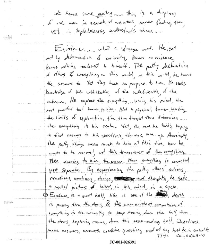 Existence….. what a strange word. He, set out by determination & curiosity, knows no existence, knows nothing realevent to himself. The petty destinations of others & everything on this world, in this world, he knows the answers to. Yet they have no purpose to him. He seeks knowledge of the unthinkable, of the indefineable, of the unknown. He explores the everything…using his mind, the most powerful tool known to him. Not a physical barrier blocking the limits of exploration, time thru thought thru dimensions…. the everything is his realm. Yet, the more he thinks, hoping to find answers to his questions, the more come up. Amazingly, the petty things mean much to him at this time, how he wants to be normal, not this transceiver of the everything. Then, ocuring to him, the answer. How everything is connected yet seperate. By experiencing the petty others’ actions, reactions, emotions, doings, [scribble] and thoughts, he gets a mental picture of what, in his mind, is a cycle. Existence is a great hall, life is one of the [scribble] rooms, death is passing thru the doors, & the ever-existant compulsion of everything is the curiosity to keep moving down the hall, thru the doors, exploring rooms, down this never-ending hall. Questions make answers, answers conceive questions, and at long last he is content.