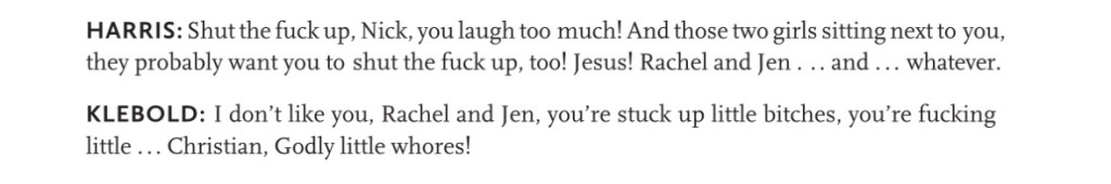 Klebold’s line: “I was Mr. Cutter tonight” echoes the performative identity of “Mr. Self Destruct.”