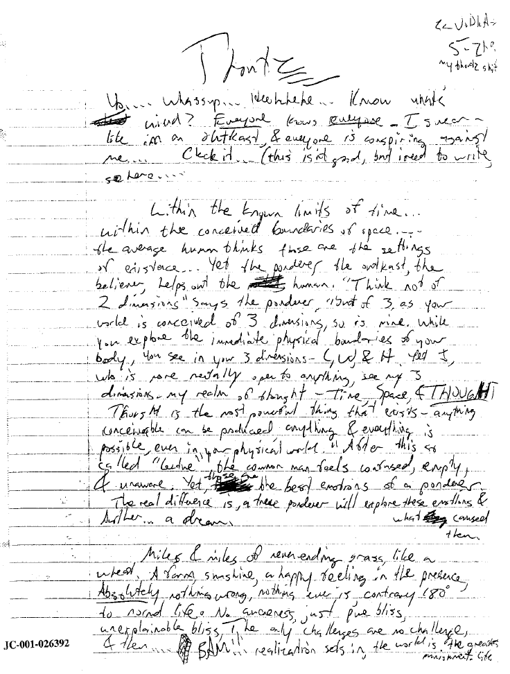 AH yes, this is me writing… just writing, nobody technically did anything, just i felt like throwing out my thoughts – this is a wierd time, wierd life, wierd existence. As i sit here (partially drunk w. a screwdriver) i think a lot. Think… Think… that’s all my life is, just shitloads of thinking… all the time… my mind never stops… music runs 24/7 (xpt for sleep), just songs i hear, not necessarily good or bad, & thinking… about the asshole [edited] in Gym class, how he worries me, about driving, & my family, about friends & doings with them, about girls i kno (mainly [edited] & [edited] how i kno i can never have them, yet i can still dream… I do shit to supposedly ‘cleanse’ myself in a spiritual, moral sort of way (deleting the ‘limits’ on my comp, not getting drunk for periods of time, trying not to ridicule/make fun of people [edited] at school, yet it does nothing to help my life – moraly. My existence is shit. To me – how i feel that i am in eternal suffering. in infinite directions in infinite realities – yet these [Dylan scribble] realities are fake- artificial, induced by thought, how everything connects, yet it’s all so far apart…. & i sit & think… Science is the way to find solutions to everything, right? I still think that, yet i see different views of shit now like the mind – yet if the mind is viewed scientifically… HMM I dwell in the past… thinking of good & bad movies
