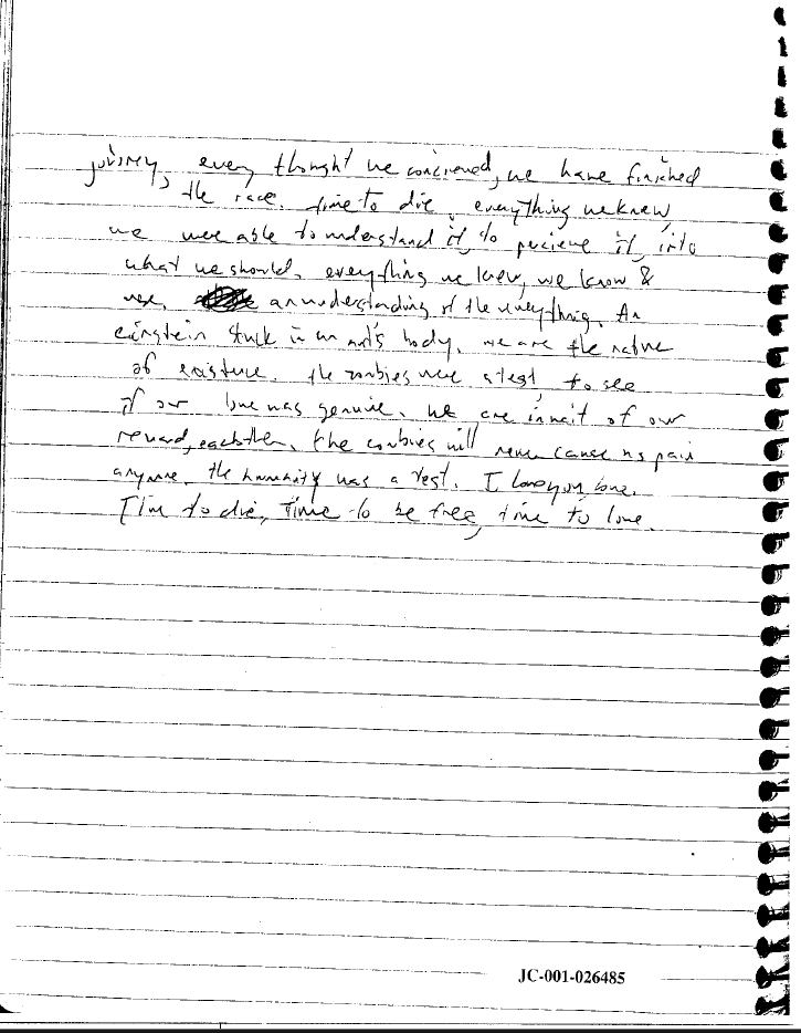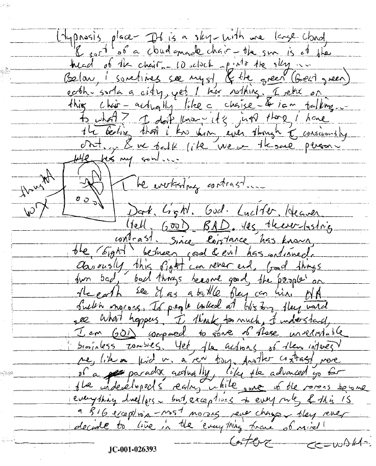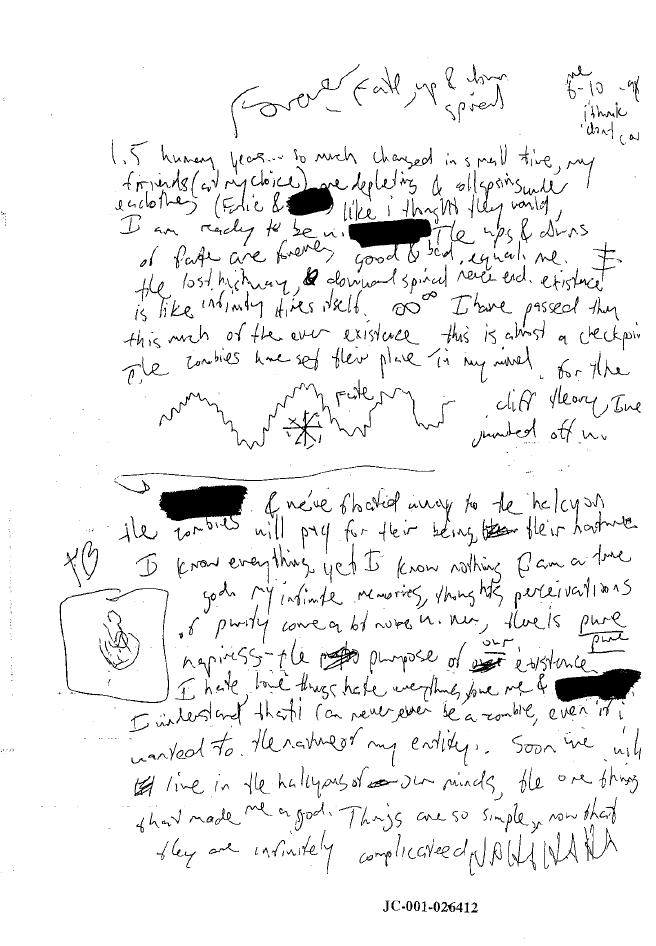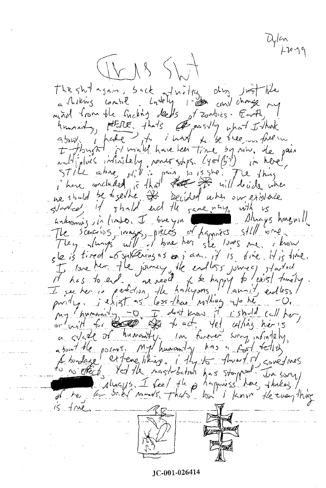 Forever, Fate, up & down spiral 1.5 human years…. so much changed in small time, my friends (at my choice) are Sketch of fate by Dylan Klebolddepleting & collapsing under each other (Eric & [edited]) like i thought they would. I am ready to be w. [edited]. The ups & downs of fate are forever, good & bad, equal. me. [tri-tier cross] the lost highway, & downward spiral never end. existence is like infinity times itself. ∞ ∞ I have passed thru this much of the ever existence. this is almost a checkpoint. The zombies have set their place in my mind. for the cliff theory, Ive jumped off w. [arrow down to] [edited] & we’ve floated away to the halcyon. the zombies will pay for their being, their nature. I know everything, yet I know nothing. I am a true god. my infinite memories, thoughts, Dylan Klebold’s thought boxperceivations of purity come a lot more w. her, there is pure pure hapiness — the pupo purpose of our our existence. I hate, love things. hate everything, love me & [edited]. I understand that i can never ever be a zombie, even if i wanted to. the nature of my entity.. Soon we will live in the halcyons of our minds, the one thing that made me a god. Things are so simple, now that they are infinitely complicated. HAHAHAHA