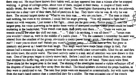 Slow, numb, filled with resentment and exhaustion. What’s striking is that Klebold doesn’t mention anger here, only thought, suggesting that “Piggy” appealed to the reflective, not the violent, part of him. Both the song and the entry are about being lost in one’s own head, watching life happen to other people, and feeling powerless to join it.