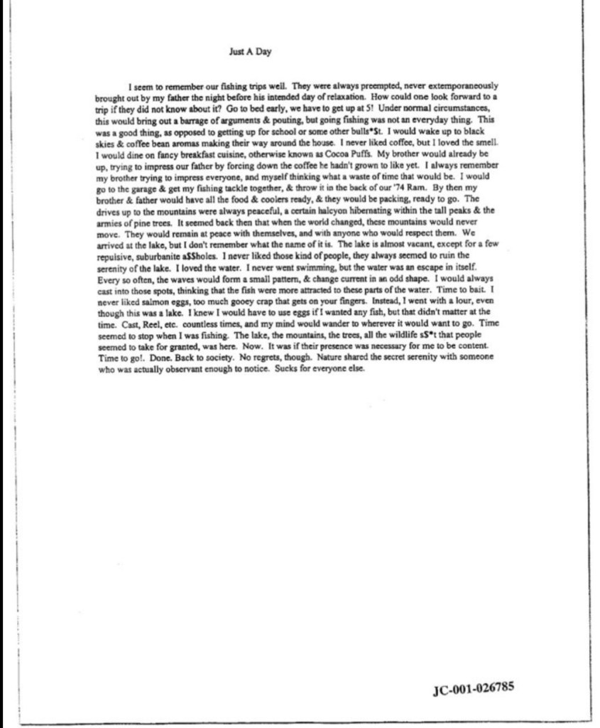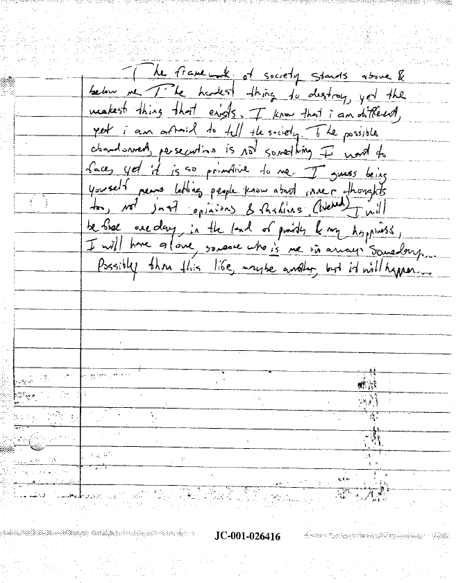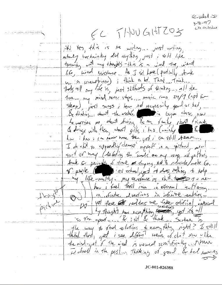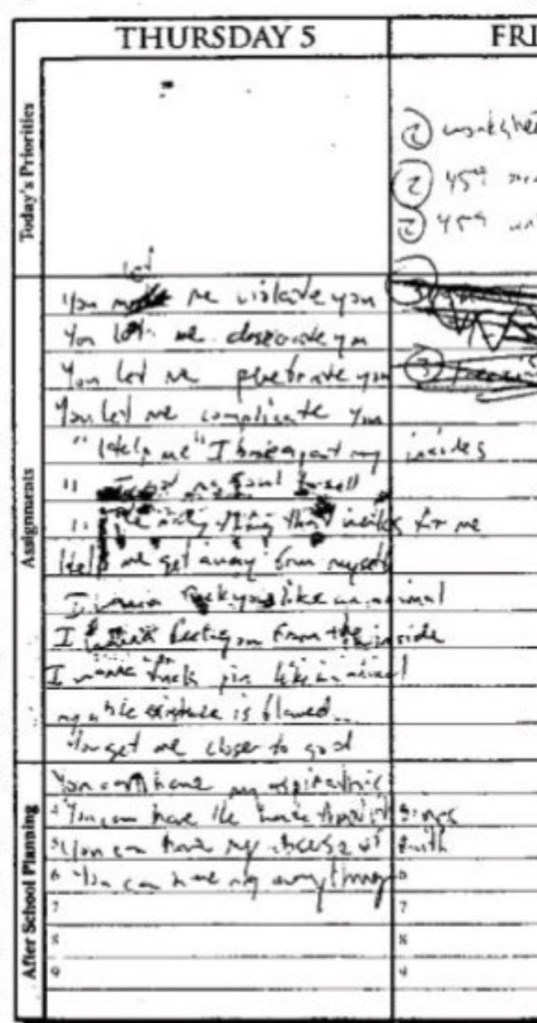 Ultimately, both “Hurt” and the journal recognize isolation and regret, but where Reznor’s narrator ends in fragile awareness, Klebold turns it into self-mythology.