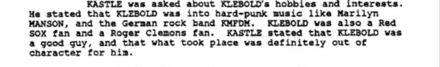 ”Mrs. Klebold indicated that Dylan had a poster of Marilyn Manson and that she asked him about it, and in particular asked him what it meant. Dylan had told her that it didn’t mean anything and that he didn’t really listen to lyrics of Marilyn Manson music, however, did listen to the music.” – police interview with the klebolds