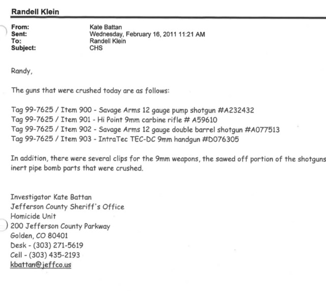 On February 16, 2011, Supervisor Jansson and Internal Affairs Investigators Paul Magor and Randy Klein transported the remaining evidence items, which consisted of the guns, clips, and inert pipe bombs, to Western Metals. All of these items were then crushed.” – Kate battan files