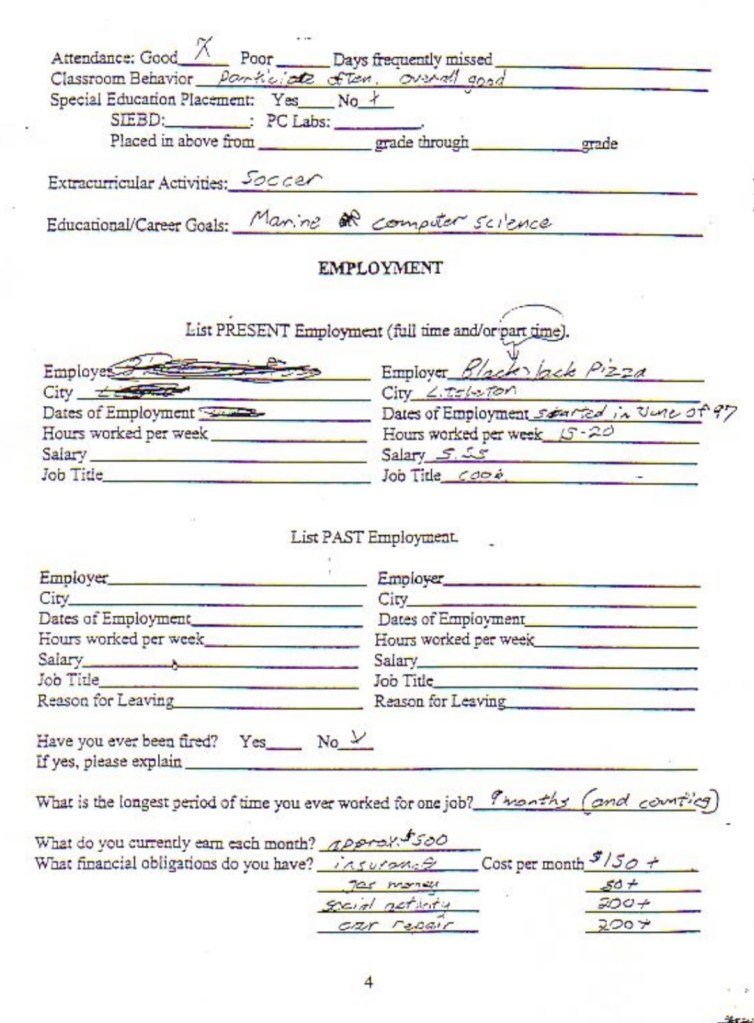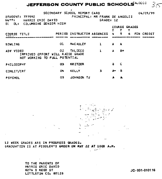 Sgt. Mark Gonzales, a former Columbine High School graduate and Marine Corps recruiter, had access to the school’s student list and phone numbers. That was how he came across Eric Harris. On April 2, 1999, Gonzales called Eric and conducted a twenty minute pre-screening interview. During this call, Eric did not disclose that he was taking medication or that he had any medical conditions. He only mentioned a broken wrist and a broken nose from childhood injuries.