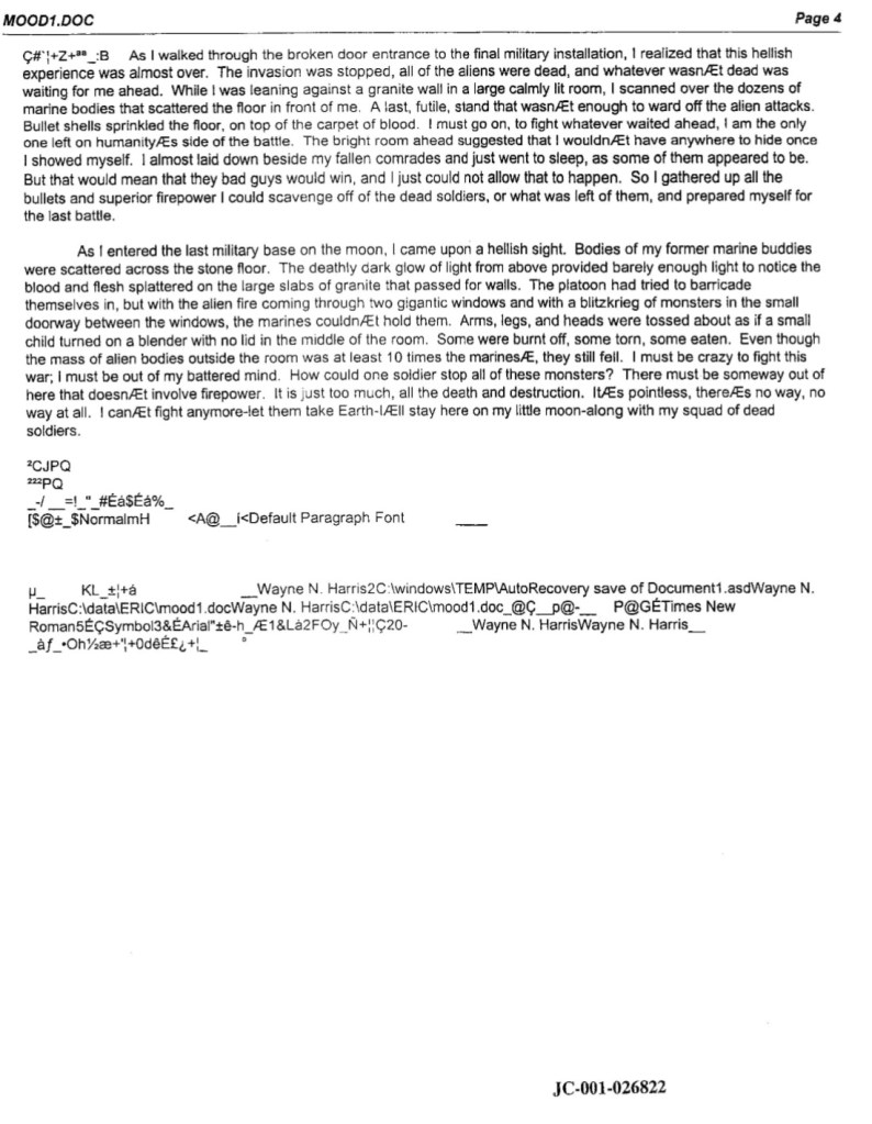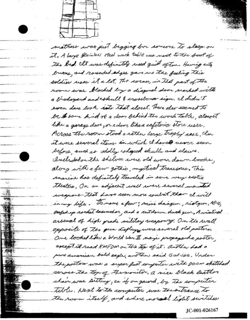 In conclusion, Eric’s interest in the military was not superficial. It was a recurring theme in his life from a young age. His 1995 and later school assignments, his fascination with military simulations in DOOM, and the creation of his own phonetic alphabet and code system all demonstrate a long standing engagement with military identity and structure. As he himself wrote, he believed he would have been a good Marine, likely understanding that his medical history, particularly his prescription medication, would prevent official enlistment.