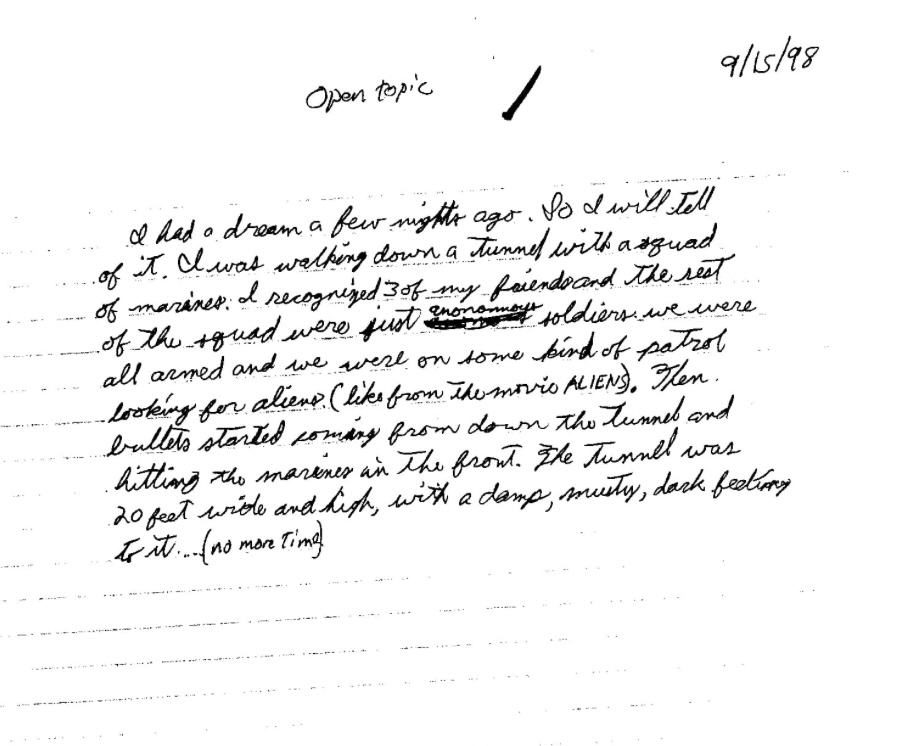 In this third assignment, dated 9/15/98, Eric again places himself in a military scenario, this time as part of a squad of Marines on patrol with his friends as well. The setting is more science fiction inspired, referencing Aliens, but the core framework remains the same. Even in a brief, unfinished piece, he defaults to the Marine identity and uses it as the narrative lens in this open topic. It’s another example of how frequently the Marine theme appeared in his writing, regardless of whether the scene was realistic or fictional.