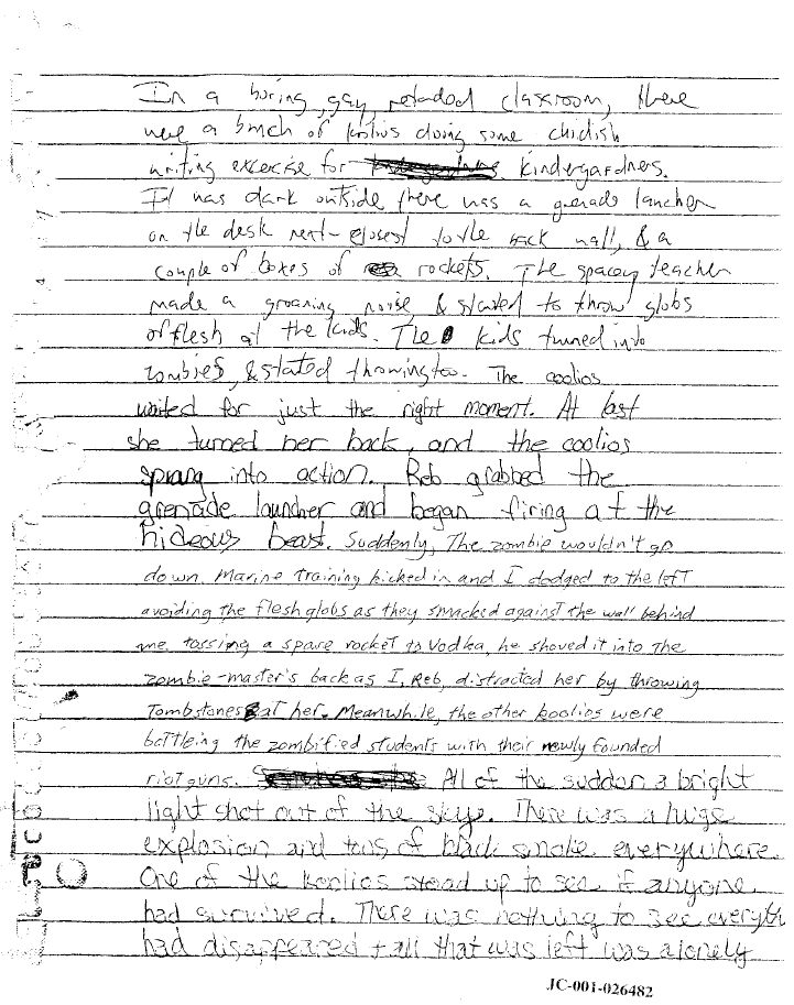 What stands out in Eric’s section is that he’s the only one who explicitly inserts ‘Marine training’ and frames himself as a marine, with that kind of knowledge. The others keep the scene in a silly, fictional classroom zombie setting, while Eric immediately shifts into a tactical, military perspective. Even when everyone is messing around, he defaults to that identity in a way the others don’t.