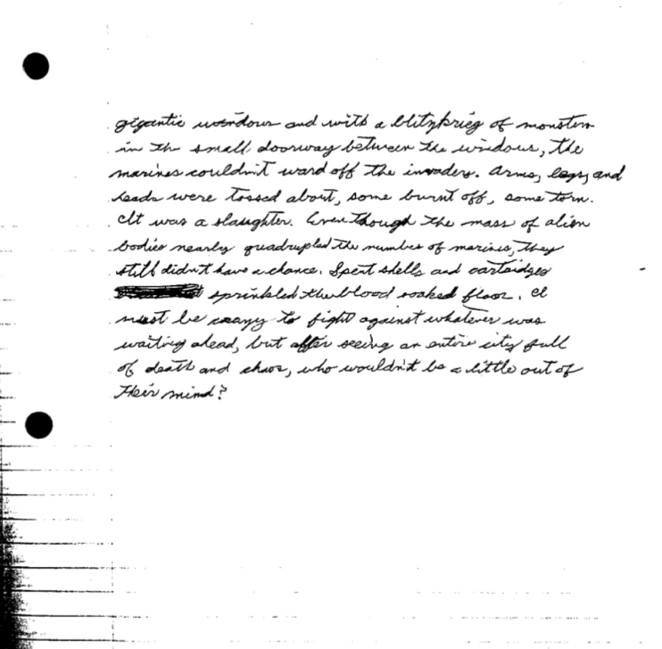 “…gigantic windows and with a blitzkrieg of monsters in the small doorway between the windows, the marines couldn’t ward off the invaders. Arms, legs, and heads were tossed about, some burnt off, some torn. It was a slaughter. Even though the mass of alien bodies nearly quadrupled the numbers of marines, they still didn’t have a chance. Spent shells and cartridges sprinkled the blood-soaked floor. It must be scary to fight against whatever was waiting ahead, but after seeing an entire city full of death and chaos, who wouldn’t be a little out of their mind?”
