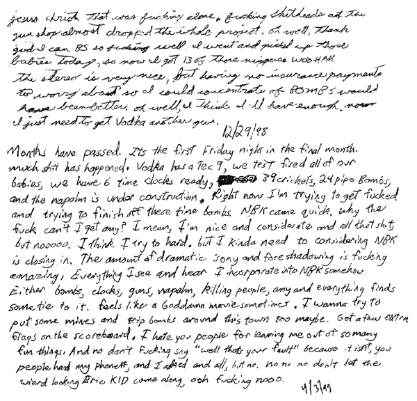 Months have passed. Its the first Friday night in the final month. much shit has happened. Vodka has a Tec 9, we test fired all of our babies, we have 6 time clocks ready, 39 crickets, 24 pipe bombs, and the napalm is under construction. Right now I’m trying to get fucked and trying to finish off these time bombs. NBK came quick. why the fuck cant I get any? I mean, I’m nice and considerate and all that shit, but nooooo. I think I try to hard. but I kinda need to considering NBK is closing in. The amount of dramatic irony and foreshadowing is fucking amazing. Everything I see and I hear I incorporate into NBK somehow. Either bombs, clocks, guns, napalm, killing people, any and everything finds some tie to it. feels like a Goddamn movie sometimes. I wanna try to put some mines and trip bombs around this town too maybe. Get a few extra flags on the scoreboard. I hate you people for leaving me out of so many fun things. And no don’t fucking say, “well thats your fault” because it isnt, you people had my phone #, and I asked and all, but no. no no no dont let the weird looking Eric KID come along, ohh fucking nooo.