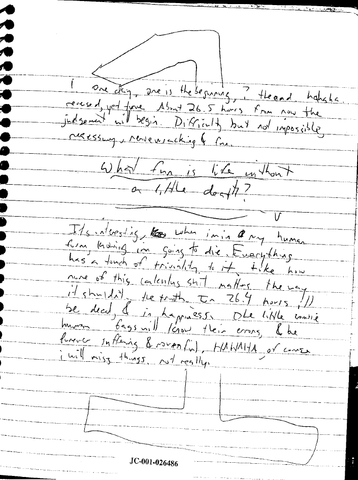 Dylan also references an imminent timeline in an undated journal entry, writing that “about 26.5 hours from now the judgement will begin.” While the entry is undated, the timeframe places it within roughly a day of the attack, most likely written on April 19.