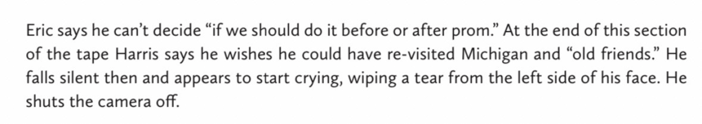 The fact that Eric frames the timing around a school event, rather than around April 19 (the Oklahoma City bombing / Waco anniversary associated with Timothy McVeigh) or April 20 (Hitler’s birthday) indicates that the date was still flexible at this stage. If they were aiming for one of those dates all along, there wouldn’t be this much back and forth about when to do it.