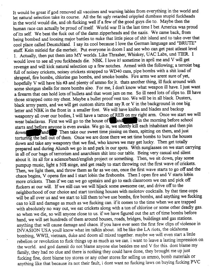 Well folks, today was a very important day in the history of R. Today along with Vodka and someone else who I wont name, we went downtown and purchased the following; a double barrel 12ga. shotgun, a pump action 12ga. shotgun, a 9mm carbine, 250 9mm rounds, 15 12ga slugs, 40 shotgun shells, 2 switch blade knives, and total of 4 – 10 round clips for the carbine. we……. have…. GUNS! we fucking got em you sons of bitches! HA! HAHAHA! neener! Booga Booga. heh. its all over now. this capped it off, the point of no return. I have my carbine, shotgun, ammo and knife all in my trunk tonight and theyll there till tomorrow… after school you know its really a shame. I had a lot of fun at that gun show, I would have loved it if you were there dad. we would done some major bonding. would have been great. oh well. but, alas, I fucked up and told [censored] about my “flask”. that really disappoints me. [censored] I know you thought it was good for me… in the long run and all that shit, smart of you to give me a such big raise and then rat me out, you figure it was supposed to cancel each other? god damn flask, that just fucked me over big time. now you all will be on my ass even more than before about being on track. I’ll get around it though, If have to cheat and lie to everyone then thats fine. THIS is what I am motivated for, THIS is my goal. THIS is what I want to do with my life! you know whats weird, I dont feel like a punching through a door because of the flask deal, probly cause I am fucking armed now. I feel more confident, stronger, and more Godlike. I have confidence in my ability to dese(cei)ve people. hopefully Ill make it to April, but that might not happen. Ug, Its been a busy weekend, I need to sleep, I’ll continue tomorrow. 11/22/98