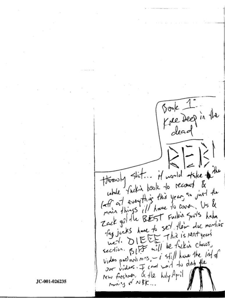 One of the reference to timing appears in the document titled NBK.doc, which was saved on Eric Harris’s computer. On the FBI copy of the document, the date “4-26-1998” is handwritten at the top. It is unclear whether this reflects the date the document was written, last edited, printed, or whatever.
