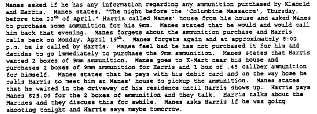 On Thursday, April 15, Eric asked Mark Manes to buy ammunition. Manes forgot. Eric called him again on the morning of Monday the 19th, Manes said he’d call him back but forget again. Eric then calls again later that day when Manes doesn’t call him back. Manes rushed out, bought the ammo, and Eric picked it up around 9 PM. Eric could have bought it himself, but after a previous close call where a purchase led to his house being called and his father picking up the phone, then Manes was the safer option in my opinion. The urgency of those calls on the 19th suggests time pressure tied to a nearby date, which aligns with April 20th being the new intended target. If it was still the 19th, at that point, I assume Eric would have called in the days after his first call on the 15th to remind Manes, why would have waited until the morning of?